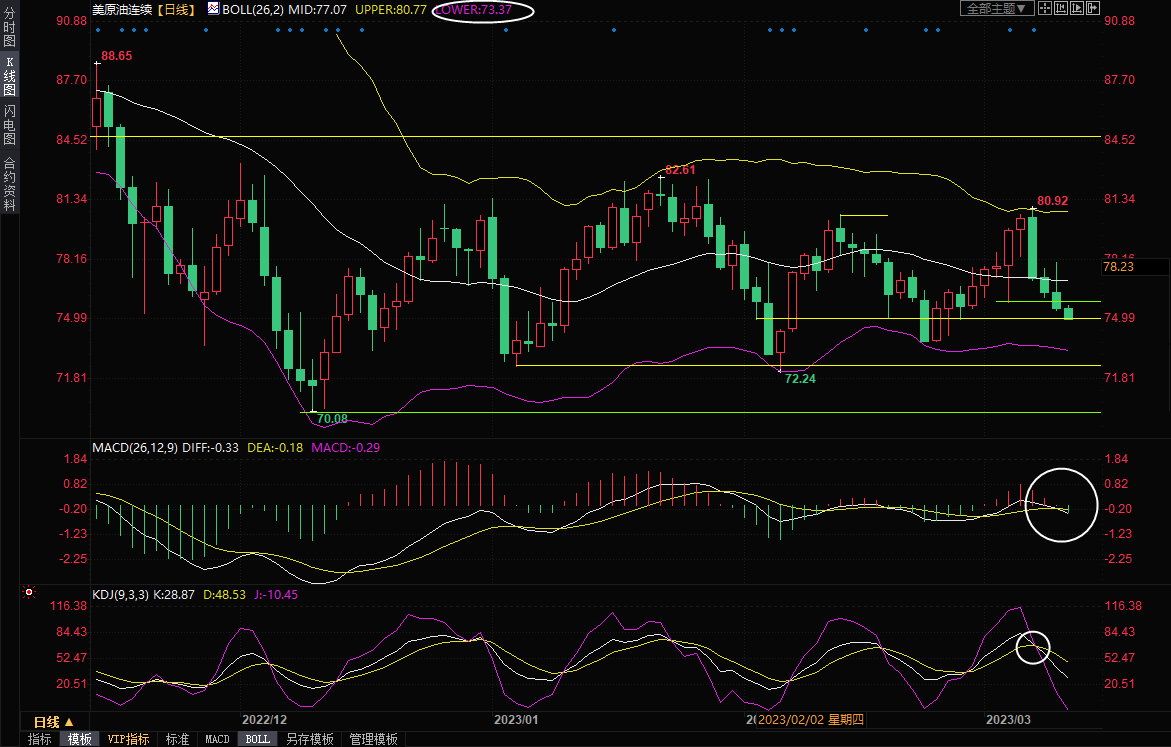 汇通财经APP讯——周五(3月10日)亚洲时段,美原油延续跌势,一度创近两周新低至74.93美元/桶附近,因为交易商对美联储频繁和更大幅加息保持警惕,对全球经济衰退的担忧有所增加,全球股市普遍走弱,对油价产生拖累。短线来看,油价偏向进一步跌向布林线下轨73.39附近。