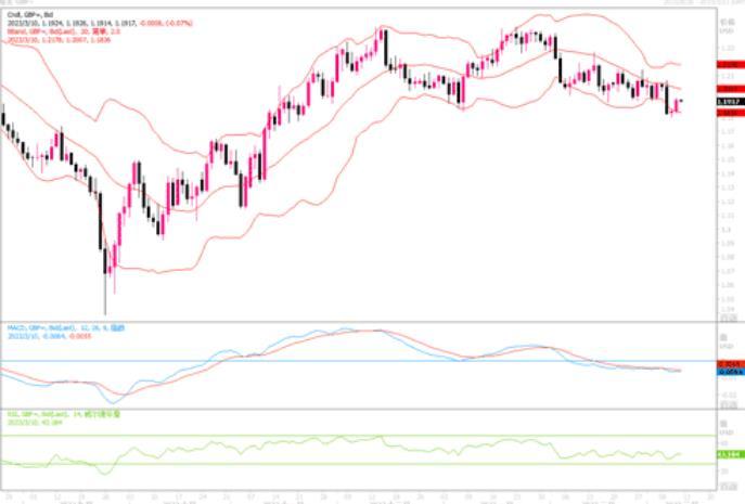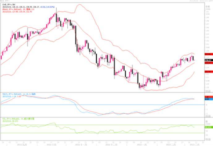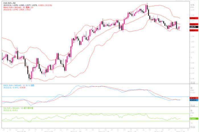 美元兑日元连续拉出大阴线,业已下穿布林带中轨,技术指标出现拐点,显示