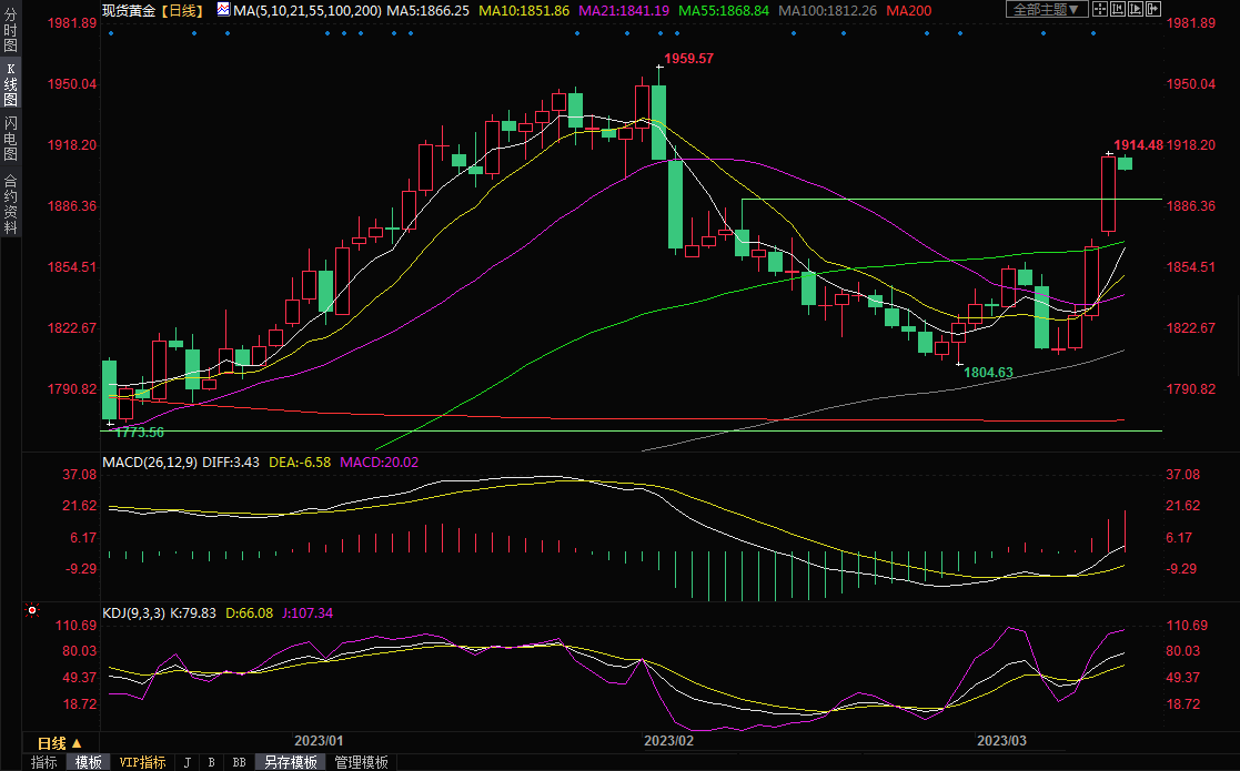 整体来看,硅谷银行倒闭的影响仍笼罩市场,美国股市跌至近两个月低位,欧洲股市录得年内最大单日跌幅,给金价提供避险支撑。市场对美联储3月份暂停加息的预期升温,美债收益率和美元指数持续大跌,也给金价提供上涨动能。虽然短线涨幅较大,金价也存在小幅回调的需求,但预计在失守2月9日高点1890附近支撑前,金价后市仍有进一步冲高机会。北京时间10:18,