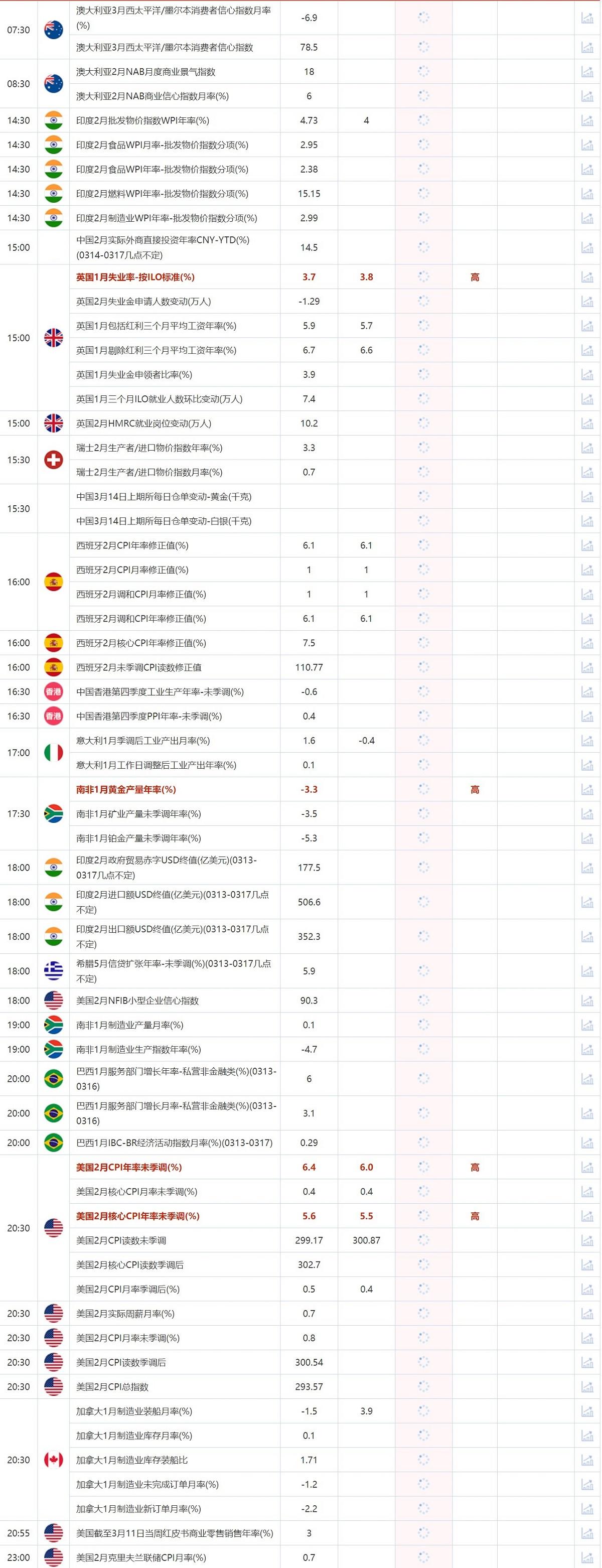 20:30 美国2月CPI年率未季调(%) , 前值 6.4 , 预期值 6 , 公布值:待发布20:30 美国2月核心CPI月率未季调(%) , 前值 0.4 , 预期值 0.4 , 公布值:待发布