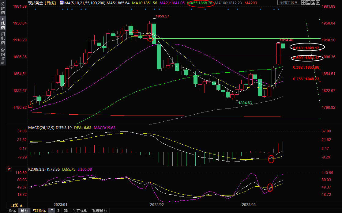 日线级别:震荡上涨;连续山歌交易日大幅上涨,使得金价连续突破55日均线1868.78、2月9日高点1890关口和1960-1804跌势的61.8%回撤位1899.17多个关键位置,MACD金叉向上,KDJ金叉运行,在失守1890关口前,金价存在进一步上涨机会,可能会重新涨向2月高点1960附近。短线的话,隔夜高点阻力在1914.48附近,2月1日低点阻力在1920.53附近,1月27日高点阻力在1934.94附近。