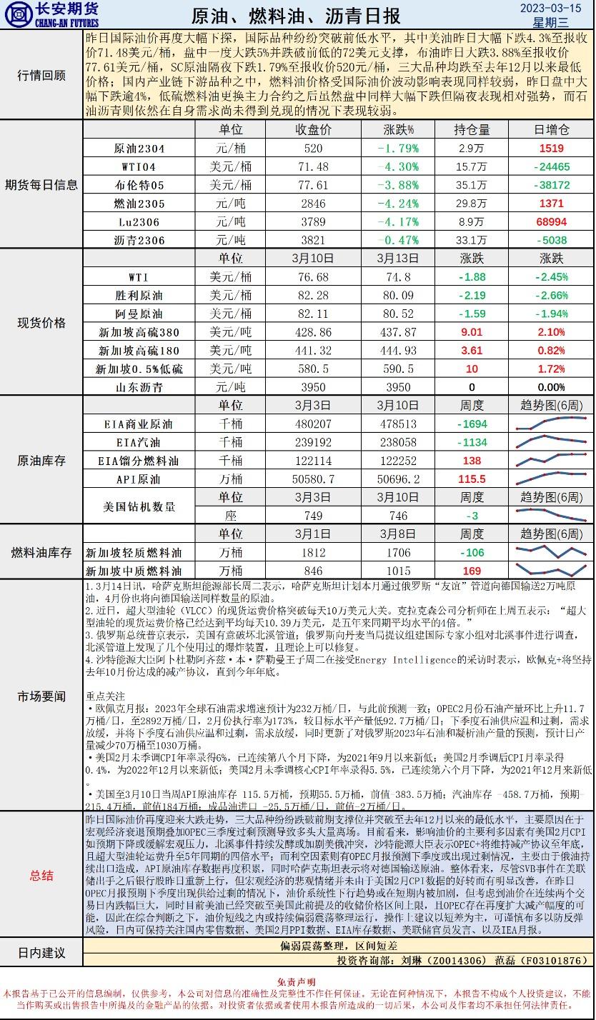 3月15日,长安期货发布原油早评,油价跳水跌破72美元大关,偏弱运行下或存反弹风险,建议区间短差操作。