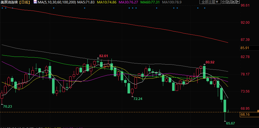 布伦特原油大跌4.9%,至每桶73.69美元。美国原油下跌4.53,报67.61美元,跌穿了70美元和68美元的技术关口,抛售加剧。布伦特和美国原油的波动性达到了一年多来的最高点,两者在周三都进入了技术性超卖区域。