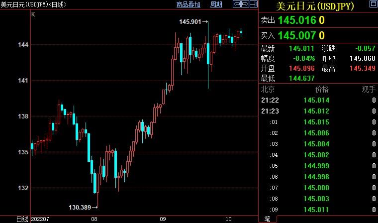 美元兑日元上涨0.15%至145.024,盘中低见143.523。越来越多的人接受美联储将坚持更激进的加息周期以抑制通胀,这继续成为美元和美元/日元的有利因素。此外美国-日本利差扩大正在打压日元并支撑