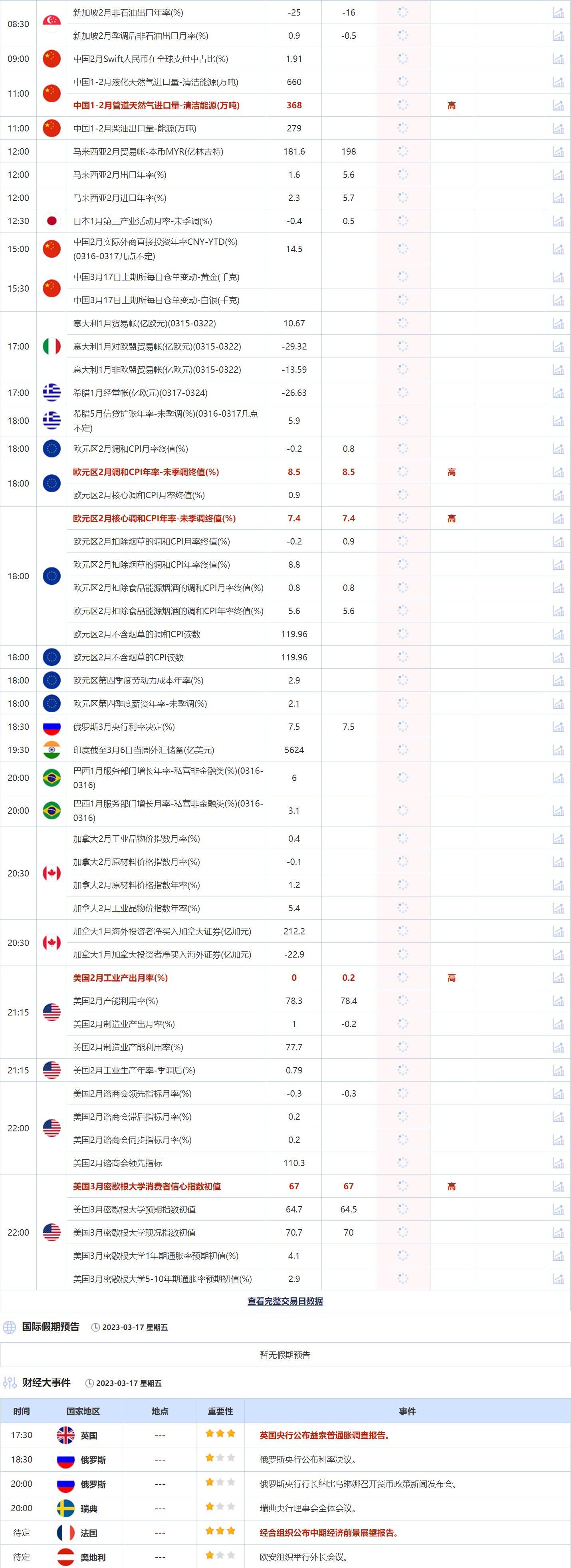 18:00 欧元区2月调和CPI年率-未季调终值(%) , 前值 8.5 , 预期值 8.5 , 公布值:待发布18:00 欧元区2月核心调和CPI月率终值(%) , 前值 0.9 , 预期值 -- , 公布值:待发布