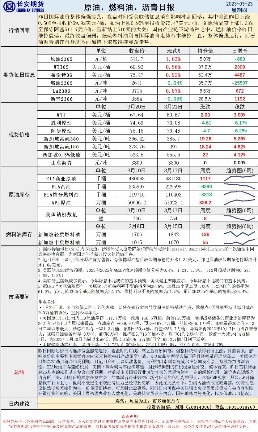 3月23日,长安期货发布原油早评,称25基点如期而至,鲍威尔鹰派言论或限制涨幅,认为价格将震荡,建议短差为主,前多谨慎持有。