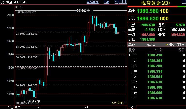现货黄金下跌0.24%至1987.78美元/盎司;COMEX期金主力合约下跌0.27%至1990.5美元/盎司;