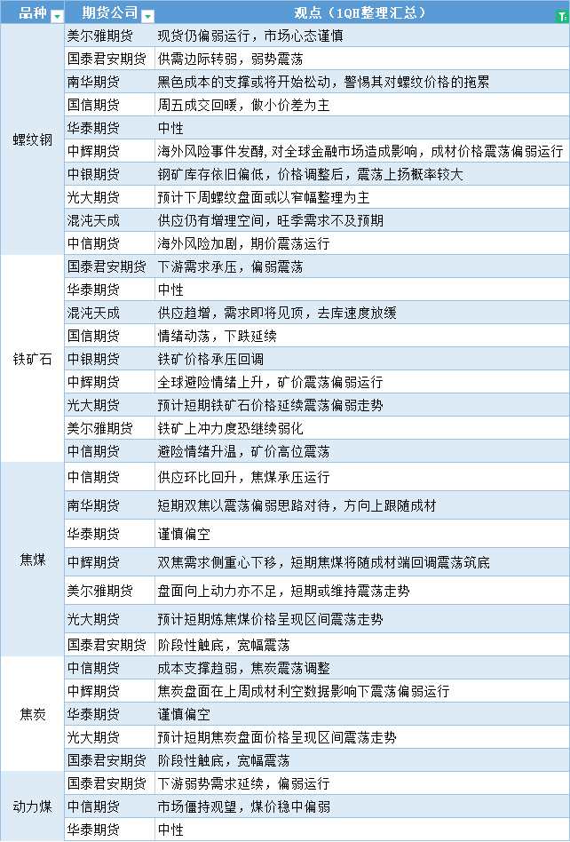 标题:期货公司观点汇总一张图:3月27日黑色系(螺纹钢、焦煤、焦炭、铁矿石、动力煤等)