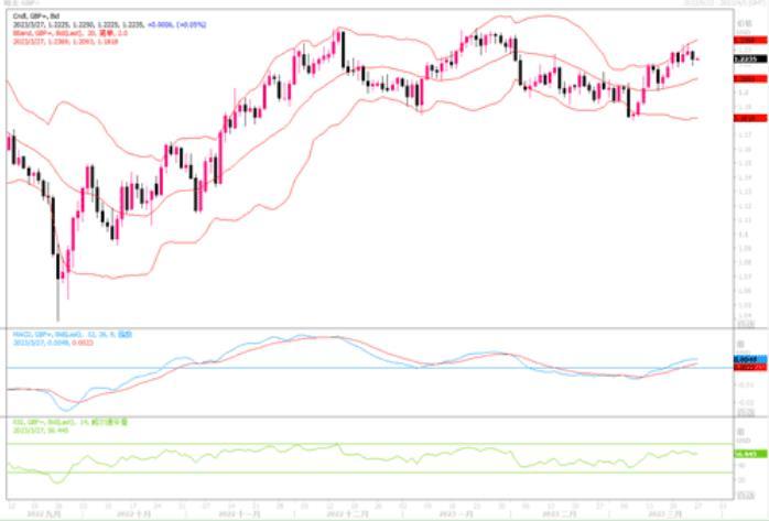 英镑兑美元下跌0.53%,至1.2220。尽管此前英国央行周四一如预期加息,本周稍早的数据显示英国2月通胀率仍高于10%。但英国央行似乎没给英镑提供料想当中的刺激力度。因为,市场焦点仍未能从欧美银行危机潮中脱离出来,而欧洲银行股本周一直处于股市抛售潮的重灾区,避险担忧在周五盖过了利率前景的影响,美元占据上风,英镑受迫难以上行突破前高。接下来,鉴于英国的通胀仍呈两位数之高,有分析预测意见认为,英国央行关上加息大门的时刻还远未到。再加之,若英国能避免经济陷入衰退情景,那么英镑后续走势还是能获得一定的支持因素的。日线图上,镑美目前支撑再1.22之上,技术指标继续摆动于均衡水平处。上方若能穿破1.23,则能获得向前高1.2448冲击的动能。而一旦继续回落跌穿布林带中轨水平1.2060的支撑,则