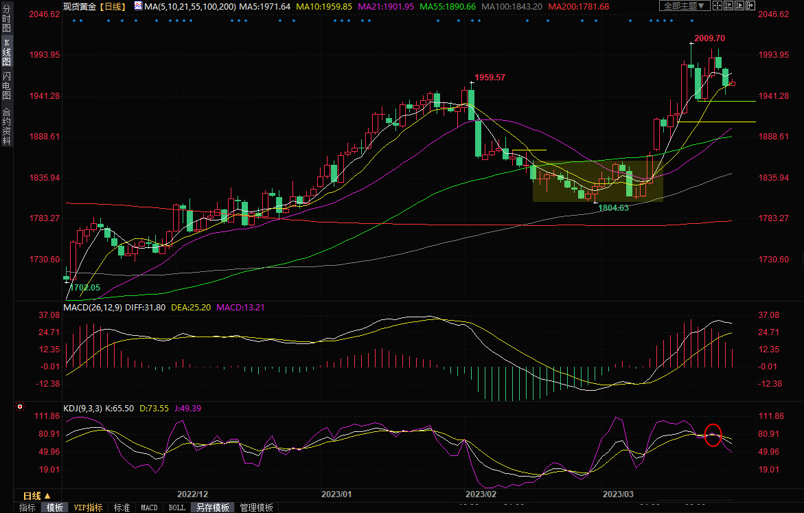 整体来看,市场对银行业的担忧情绪已经显著降温,这极大的削弱了黄金的上涨动能,尽管美元也受到拖累,对全球经济衰退的担忧情绪仍未完全消散,但美债收益率和美股上涨,令金价承压,随着金价多次上冲2000关口受阻,多头士气也明显受挫,投资者需要提防金价震荡筑顶的可能性,短线留意上周低点1934.17附近支撑,如果失守该支撑,则增加后市看空信号;上方留意5日均线1971.60附近阻力。北京时间10:15,