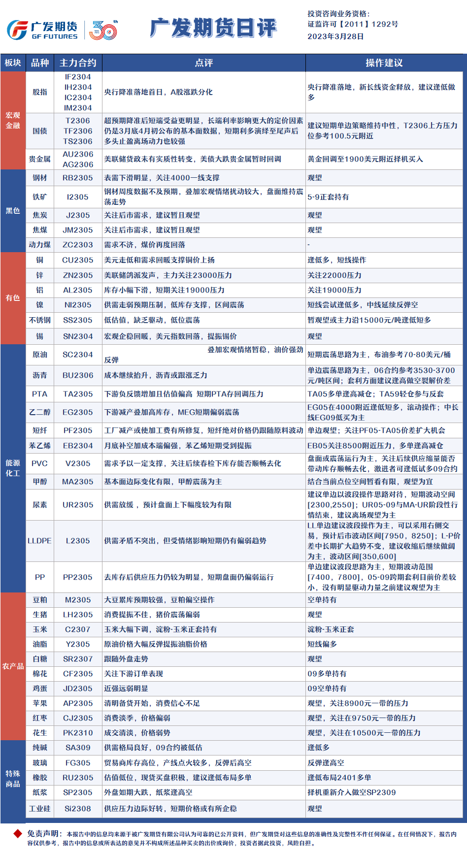 广发期货发布3月28日日评,建议黄金回调至1900美元附近择机买入,铁矿5-9正套持有;铜逢低多,短线操作;原油短期震荡思路为主,布油参考70-80美元;豆粕空单持有,油脂短线偏多,纯碱逢低做多。