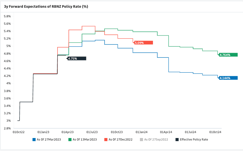 图表显示,截至3月13日,新西兰央行的OCR峰值预计为5.50%,但现在已降至5.25%