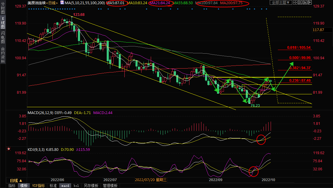 MACD金叉,KDJ金叉,在失守21日均线84.22前,后市整体仍偏向多头;颈线阻力参考9月5日高点90.16附近;若能顶破该阻力,则增加短线看涨信号;123-76跌势的38.2%回撤位阻力在94.27附近,中线有望看向100日和200日均线的双重阻力位97.75附近。