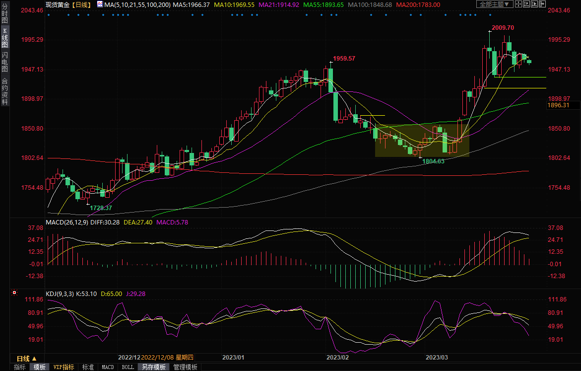 现货黄金小幅走弱,目前交投于1958.63美元/盎司附近,尽管对银行业的担忧仍未完全散去,仍有避险买盘支撑金价,但周三美元和美股上涨,金价开始受到压制。日线级别,5日均线初步下穿10日均线结成死叉,暗示金价短线下行风险较大。