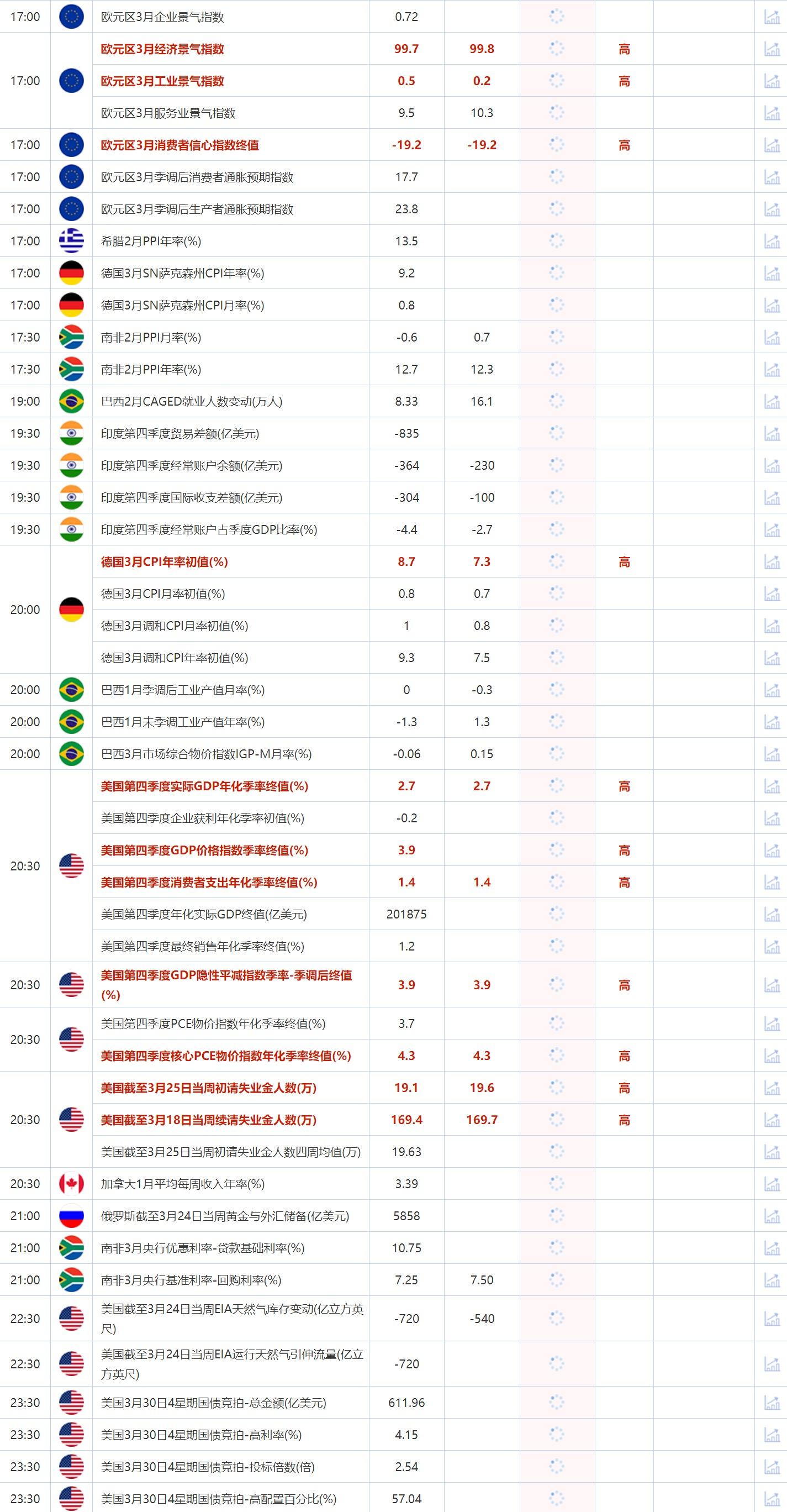 20:30 美国第四季度GDP隐性平减指数季率-季调后终值(%) , 前值 3.9 , 预期值 3.9 , 公布值:待发布20:30 美国第四季度PCE物价指数年化季率终值(%) , 前值 3.7 , 预期值 -- , 公布值:待发布