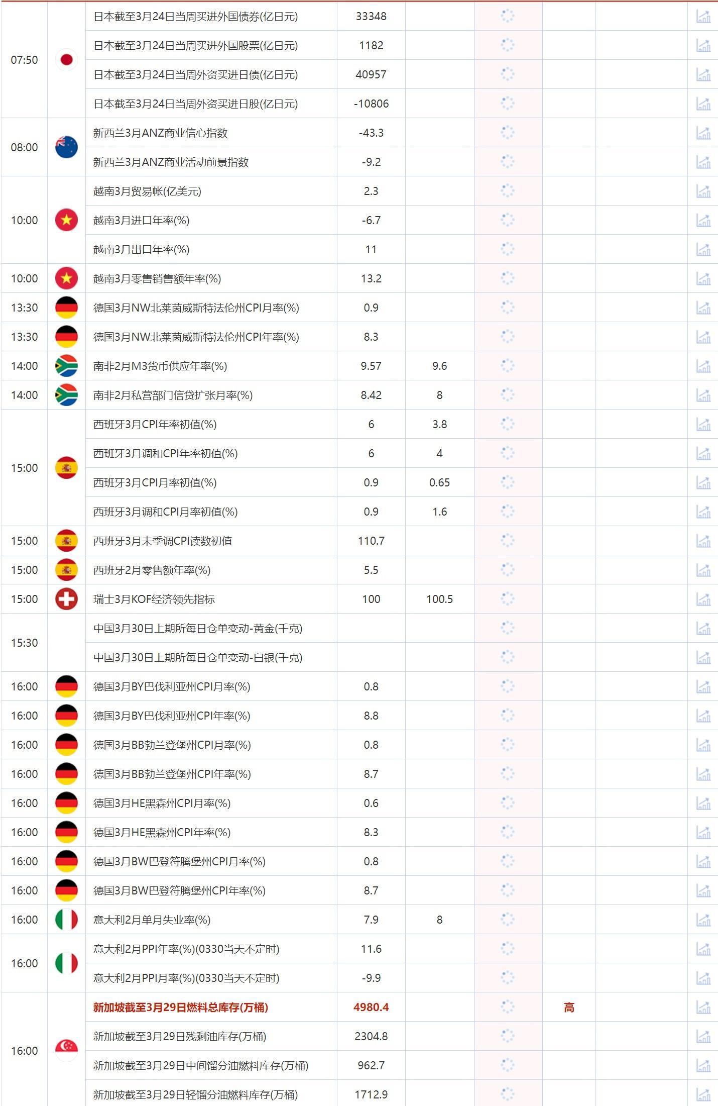 20:00 德国3月CPI年率初值(%) , 前值 8.7 , 预期值 7.3 , 公布值:待发布20:00 德国3月CPI月率初值(%) , 前值 0.8 , 预期值 0.7 , 公布值:待发布