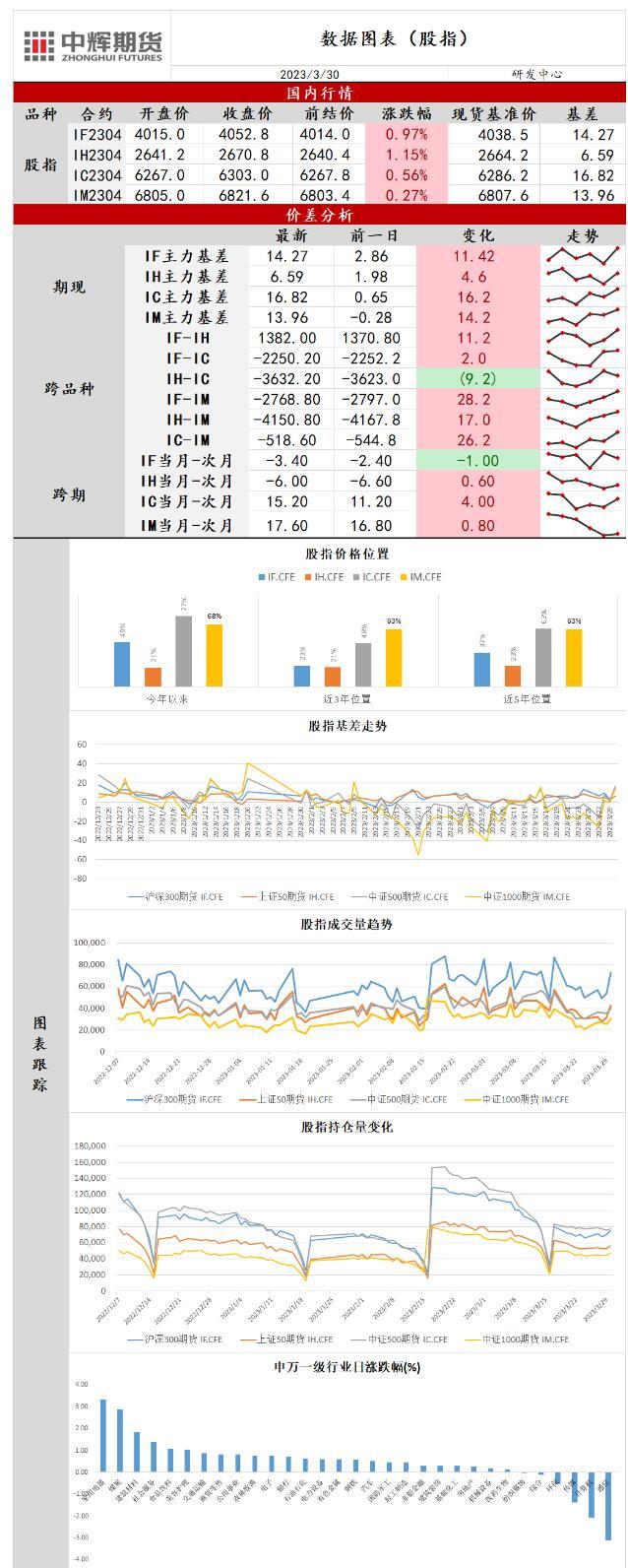 标题:中辉期货股指日报20230330:权重股支撑指数V型反转,股指集体反弹