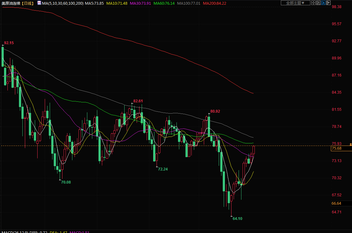 布伦特原油期货结算时到期,上涨0.6%,报收于每桶79.77美元。5月美国原油期货结算时上涨1.8%,报每桶75.67美元,本周上涨约9%。美国期金结算价报1986.2美元,下跌0.6%。