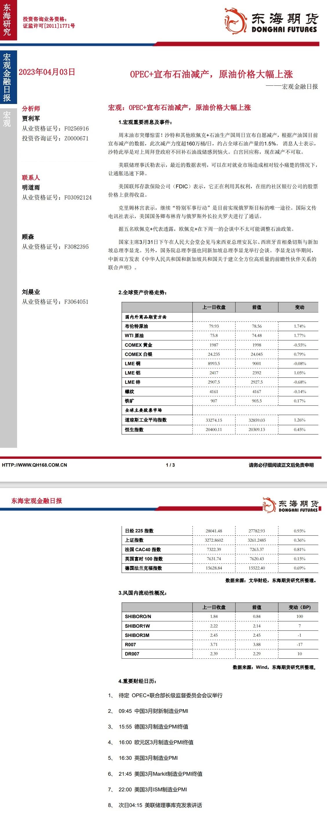 标题:【东海期货4月3日宏观金融日报】:OPEC+宣布石油减产,原油价格大幅上涨