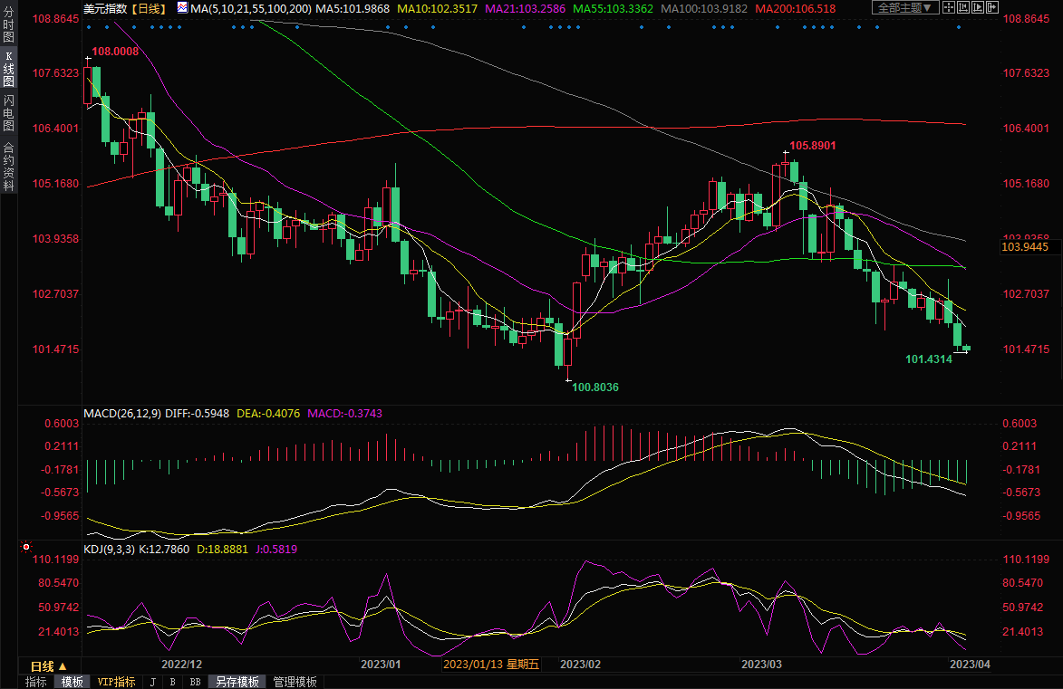 美元周二下挫0.5%至两个月低点,周三延续跌势,刷新2月2日以来低点至101.43,又一波疲软的经济数据强化了投资者对,美联储几乎完成紧缩周期的押注,即使其他央行被认为仍将提高利率,以抗击持续的高通胀。