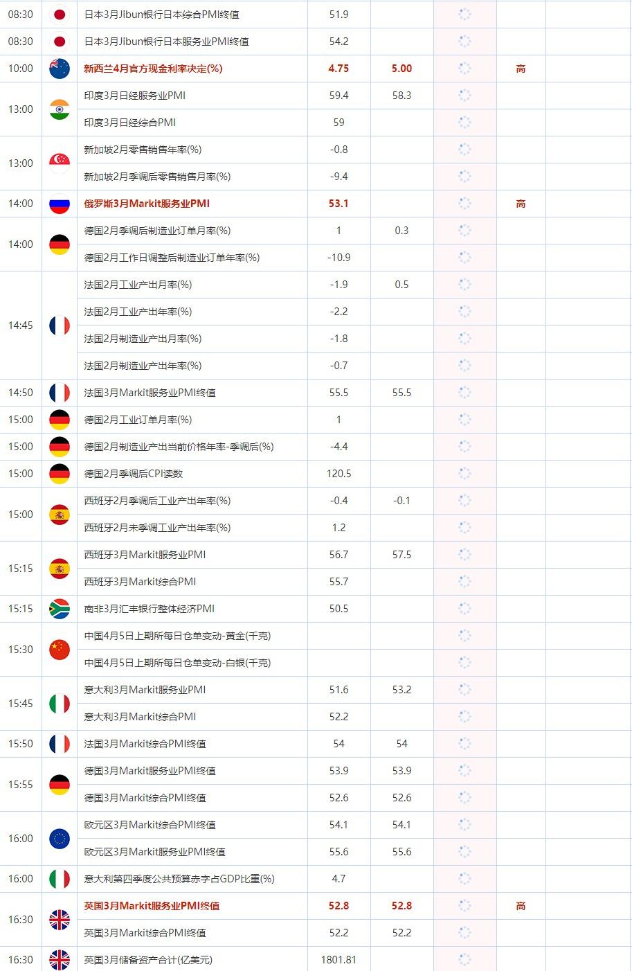 10:00 新西兰4月官方现金利率决定(%) , 前值 4.75 , 预期值 5 , 公布值:待发布13:00 印度3月日经服务业PMI , 前值 59.4 , 预期值 58.3 , 公布值:待发布