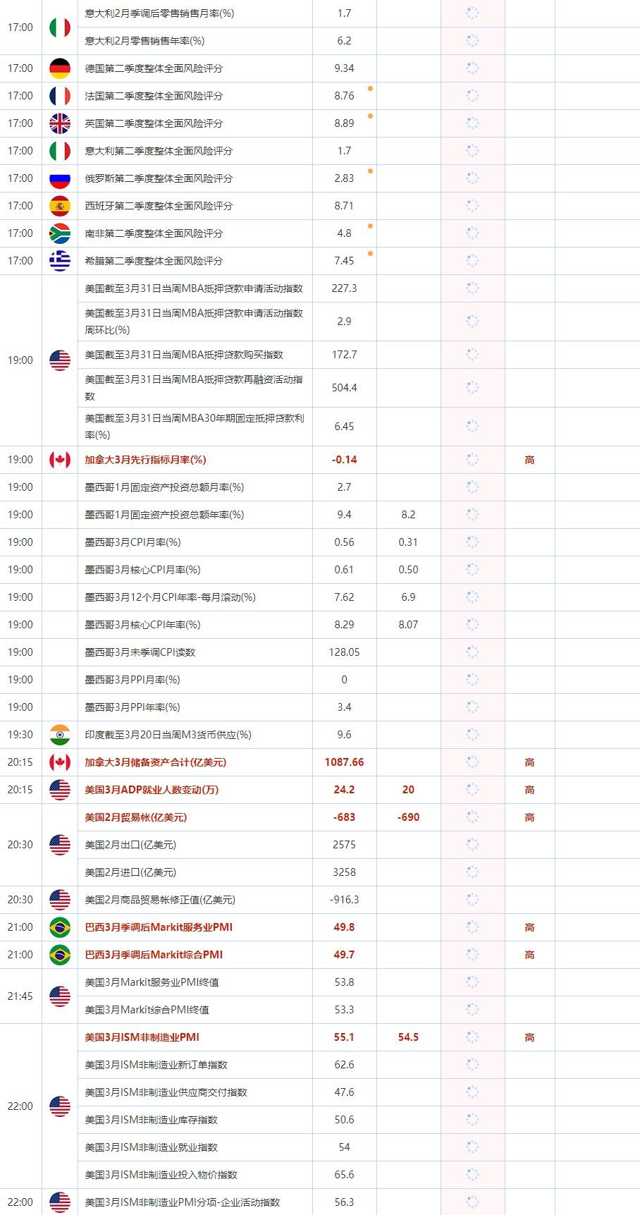 22:00 美国3月ISM非制造业PMI , 前值 55.1 , 预期值 54.5 , 公布值:待发布22:00 美国3月ISM非制造业新订单指数 , 前值 62.6 , 预期值 -- , 公布值:待发布