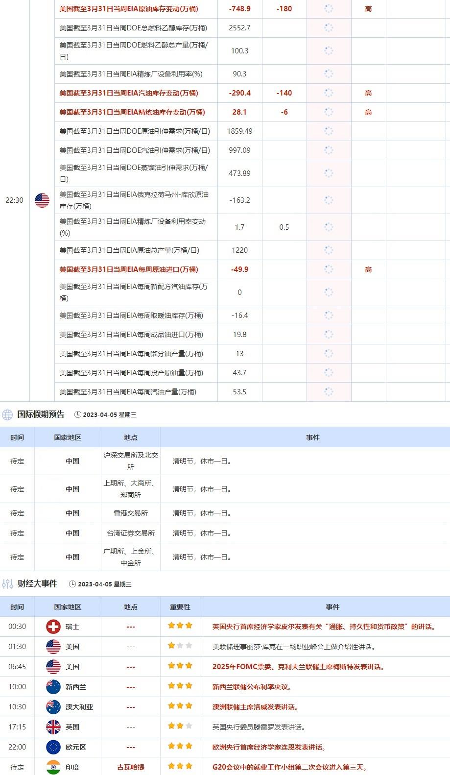 22:30 美国截至3月31日当周EIA原油库存变动(万桶) , 前值 -748.9 , 预期值 -180 , 公布值:待发布22:30 美国截至3月31日当周DOE总燃料乙醇库存(万桶) , 前值 2552.7 , 预期值 -- , 公布值:待发布