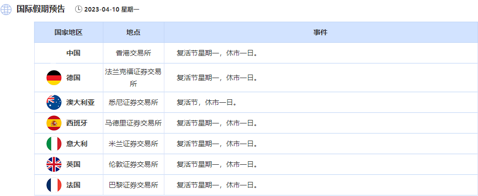 下周一(4月10日)是复活节假期,香港和欧洲多个国家金融市场继续休市,但美国、加拿大金融市场恢复交易。预计下周一(4月10日)国际