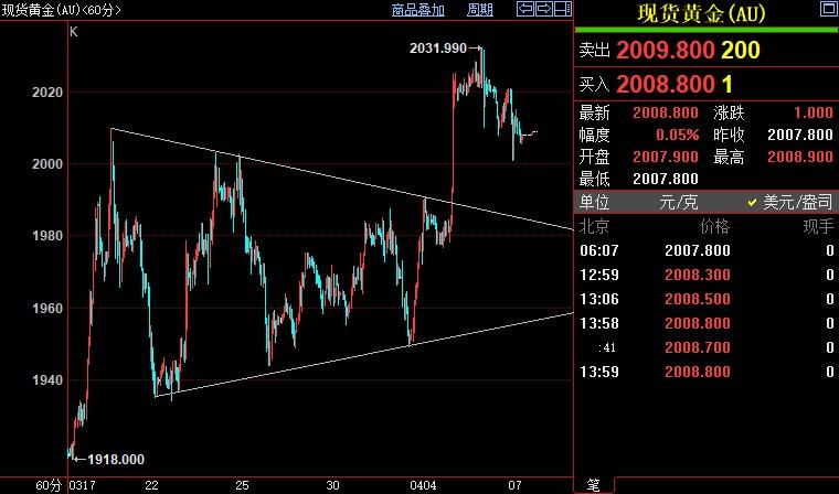 现货黄金在周四(4月6日)已经结束本周交易。金价时隔两周重新走高,收涨1.89%至2007.67美元/盎司,盘中创2022年3月9日以来新高至2031.97美元/盎司。