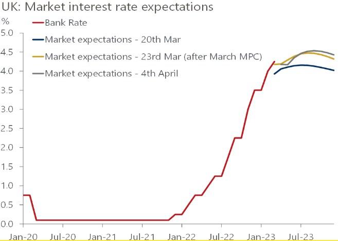 上图:利率更高峰值的市场预期正在上升(红线为银行利率,蓝线为3月20日的市场预期,黄线为3月23日的市场预期,灰线为4月4日的市场预期)