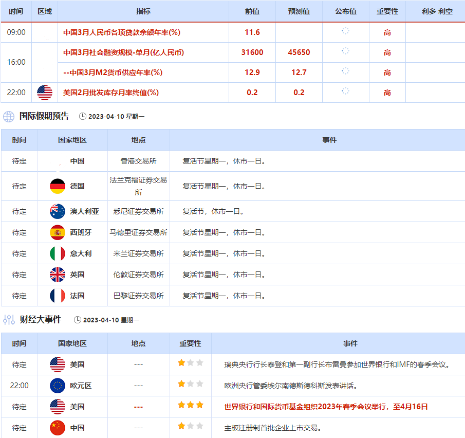 预计下周一(4月10日)国际现货黄金、美原油、布伦特原油等商品市场可能会出现跳空行情,需要予以警惕。周一重要经济数据较少,留意中国社会融资数据和M2数据变化,事件方面,留意世界银行和国际货币基金组织2023年春季会议举行,另外,FOMC永久票委、纽约联储主席威廉姆斯将参加一场经济讨论会,投资者需要予以留意。威廉姆斯是美联储3号人物,