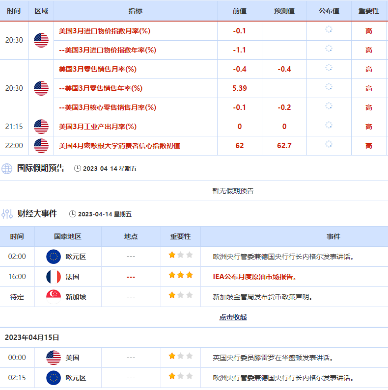 4月10日-16日当周,预计金融市场很难平静,因为将迎来重磅美国3月份CPI数据,因为该数据会影响到美联储未来货币政策,所以是全球金融市场近期都非常关注的一个经济数据,另外,接下来的一周,还将迎来有着“恐怖数据”之称的美国3月零售销售数据,其他数据方面,主要有中国3月份美国3月PPI数据、美国4月密歇根大学消费者信心指数初值、美国3月工业产出月率、CPI和PPI数据、中国3月份贸易数据、欧元区2月零售销售月率、英国2月工业产出和GDP数据。
