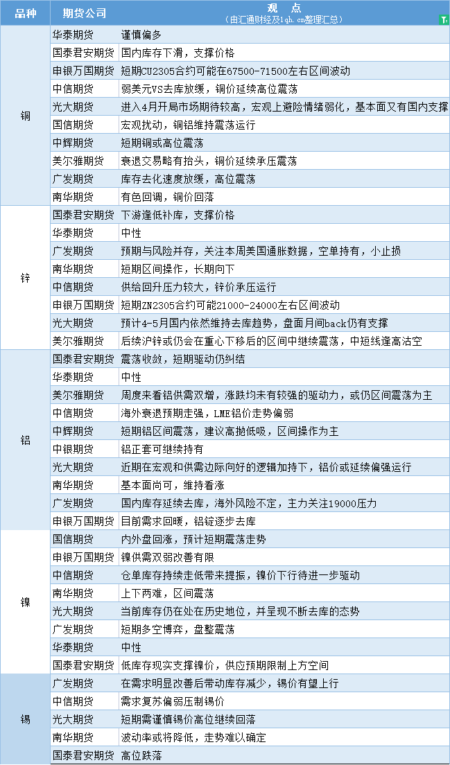 标题:期货公司观点汇总一张图:4月10日有色系(铜、锌、铝、镍、锡等)