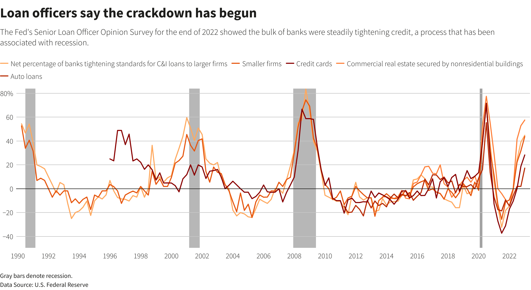 图:美联储调查显示,截至2022年底,多数银行在稳步收紧信贷。以往这种情况通常伴随着经济衰退。