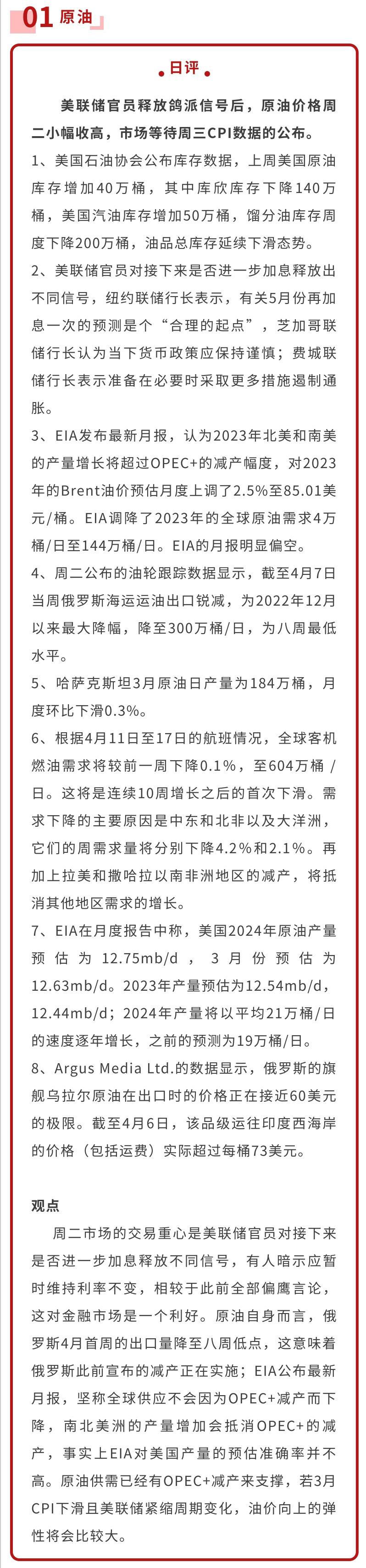 汇通财经APP讯——原油:原油自身而言,俄罗斯4月首周的出口量降至八周低点,这意味着俄罗斯此前宣布的减产正在实施;EIA公布最新月报,坚称全球供应不会因为OPEC+减产而下降,南北美洲的产量增加会抵消OPEC+的减产,事实上EIA对美国产量的预估准确率并不高。原油供需已经有OPEC+减产来支撑,若3月CPI下滑且美联储紧缩周期变化,油价向上的弹性将会比较大。