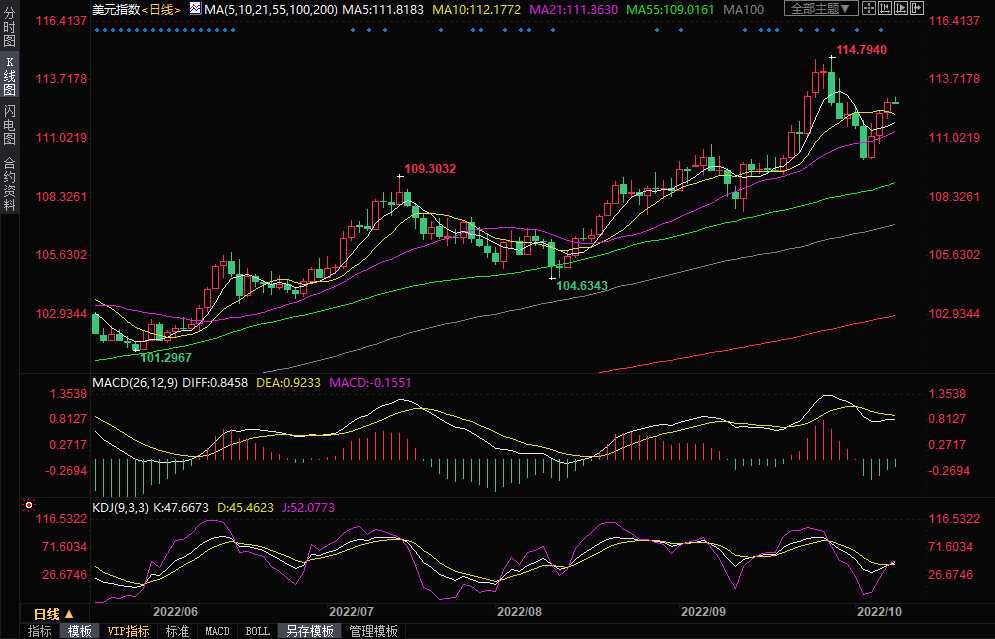 【美元指数三连阳创一周新高】美元兑主要货币上周五走强,最高触及112.88,收报112.77,涨幅约0.46%,为连续第三个交易日上涨,周一(10月10日)