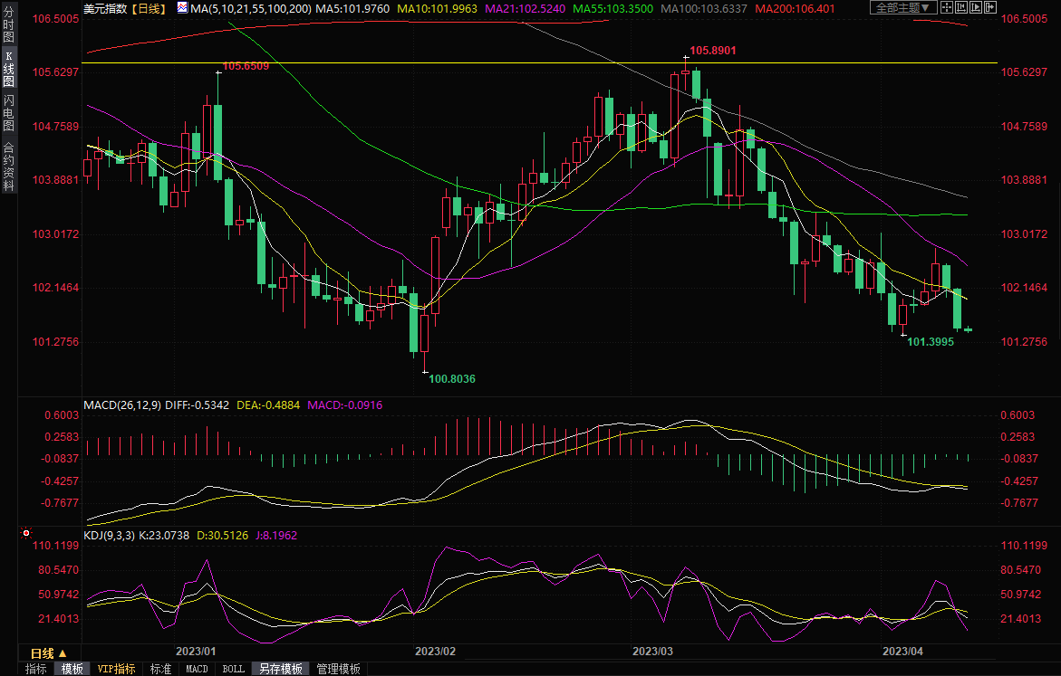 美元周三大跌0.62%,收报101.53,为2月3日以来最低收盘价,此前数据显示美国3月份消费者价格涨幅低于预期,使人们对美联储可能在5月份加息后停止加息的预期上升。Convera公司的高级市场分析师Joe Manimbo说:“总体通胀率的下降超过了预期,这支持了美联储基本上是再加一次就结束了的观点。”