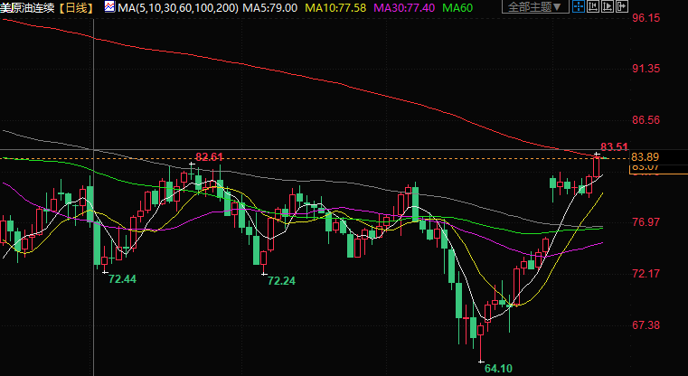 美原油交投于83.11美元/桶附近;油价周三上涨超2%,创五个月以来新高至83.51美元/桶;受益于美国通胀降温刺激了人们对美联储越来越接近结束其加息周期的希望,并缓解了美国原油库存小幅增加的影响;且IEA表示全球石油市场可能在下半年吃紧,或将推高油价。