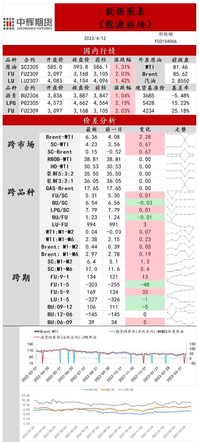 消息面:供需:据美国石油协会(API)周二数据显示,截止4月7日当周,美国原油库存增加约38万桶,汽油库存增加约45万桶,馏分油库存减少约200万桶;EIA月度报告显示,EIA预计2023年美国原油产量将增加5.5%,至1254万桶/日,2024年将增加1.7%,至1275万桶/日;数据显示,俄罗斯原油出口在下降,目前降至300万桶/日。能源:国家能源局局长章建华表示,确保国内原油产量长期稳定在2亿吨水平,天然气自给率不低于50%。