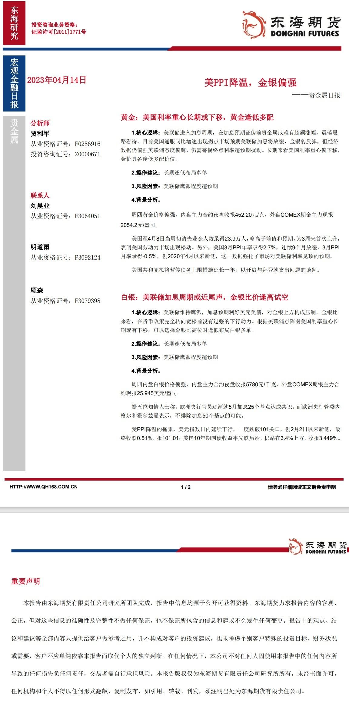 标题:【东海期货4月14日产业链日报】贵金属篇:美PPI降温,金银偏强