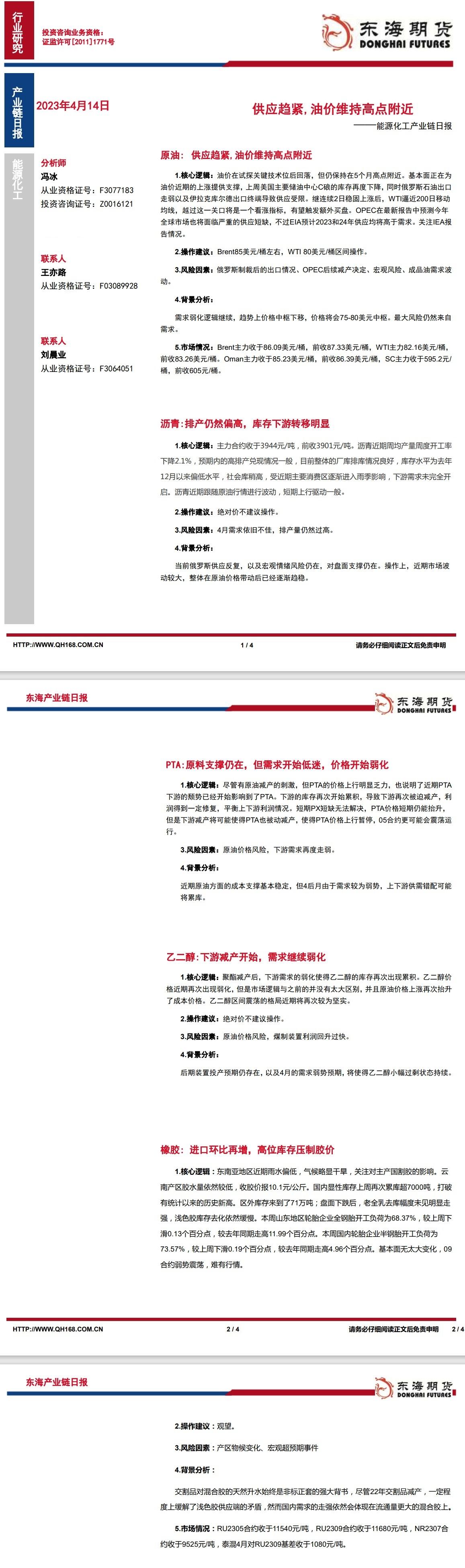标题:【东海期货4月14日产业链日报】能化篇:供应趋紧,油价维持高点附近