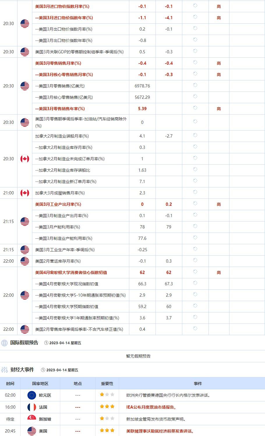 20:30 --美国3月零售销售年率(%) , 前值 5.39 , 预期值 -- , 公布值:待发布20:30 美国3月零售额季调后季率-加油站/汽车经销商除外(%) , 前值 0 , 预期值 -- , 公布值:待发布