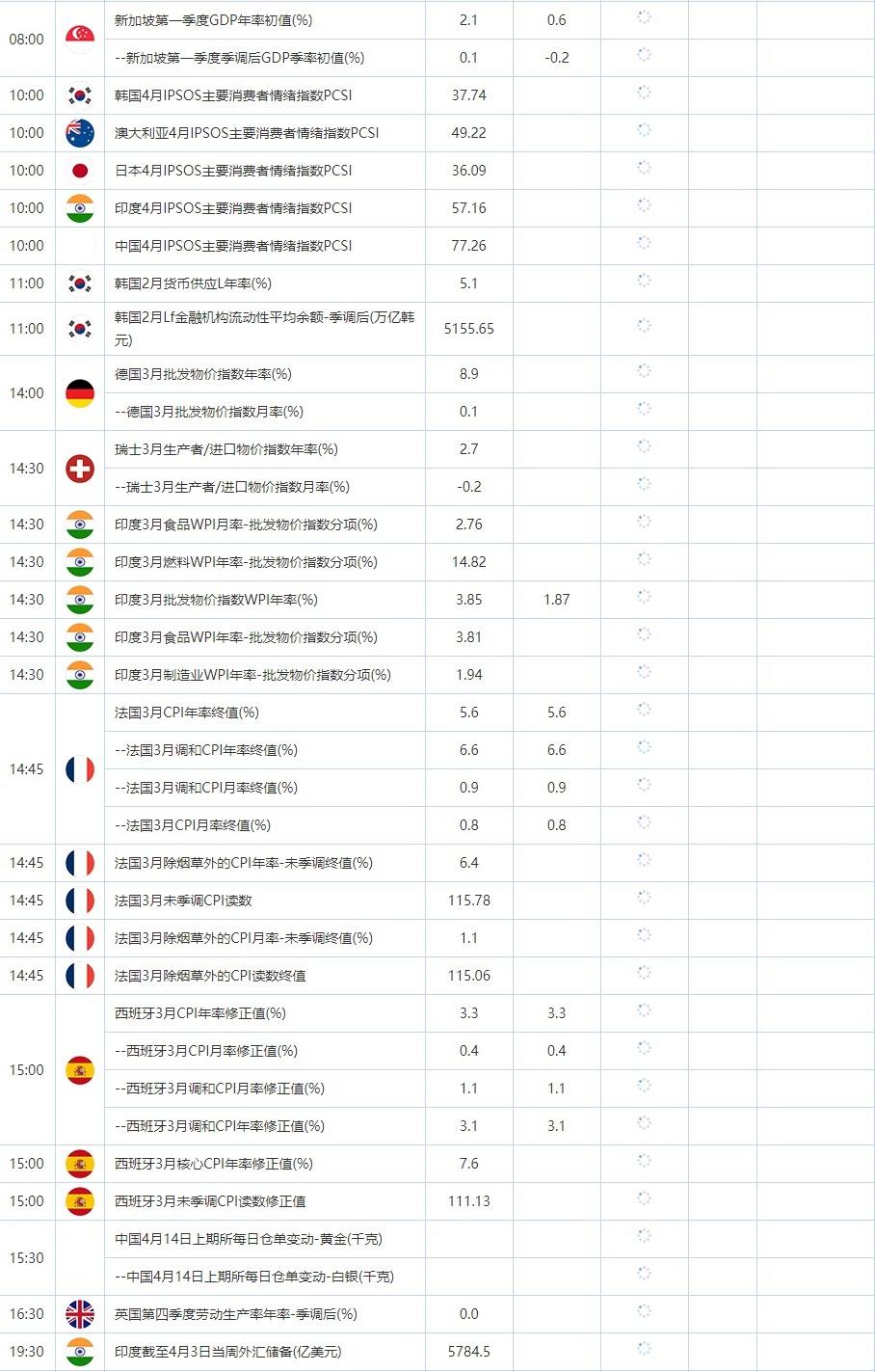 15:00 西班牙3月核心CPI年率修正值(%) , 前值 7.6 , 预期值 -- , 公布值:待发布