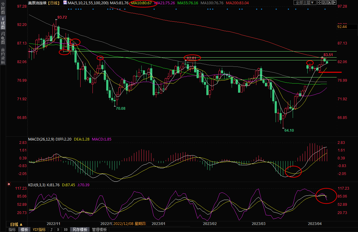 日线级别:震荡上涨;油价在200日均线和近五个月高点附近受阻后回落,KDJ高位死叉,油价短线见顶风险有所增加,初步支撑在5日均线81.76附近,4月4日高点支撑也在该位置附近,10日均线支撑在80.67附近,周二低点(逾一周低点)支撑在79.36附近,若失守该支撑,则增加短线看空信号。
