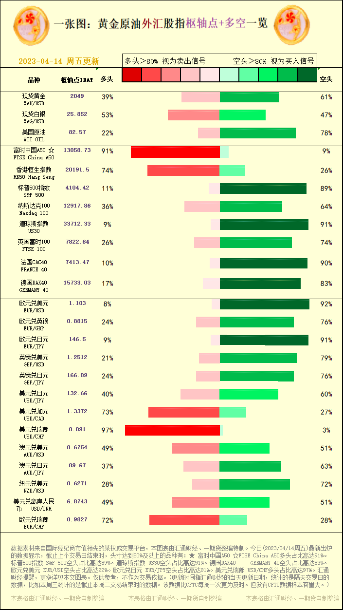 标题:一张图:黄金原油外汇股指"枢纽点+多空占比"一览(2023/04/14周五)