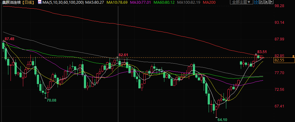 美原油交投于82.50美元/桶附近;油价上周上涨,此前西方能源监督机构称,在中国消费复苏的背景下,今年全球需求将创下历史新高;欧盟计划对俄罗斯实施第11轮制裁增加地缘局势的不确定性,支撑油价。