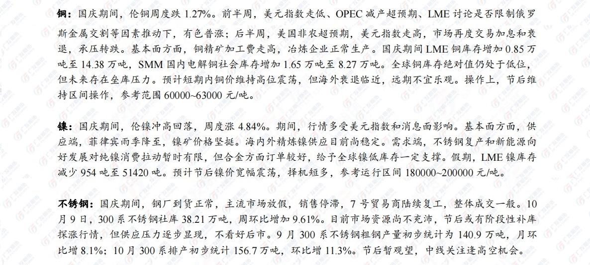 广发期货国庆假期行情回顾及节后展望,认为黄金在反弹过程中仍有下跌可能,建议逢高做空,铜节后维持区间操作,参考范围60000-63000元,铁矿石观望为主,中长期偏空,生猪保持多头思维继续参与。