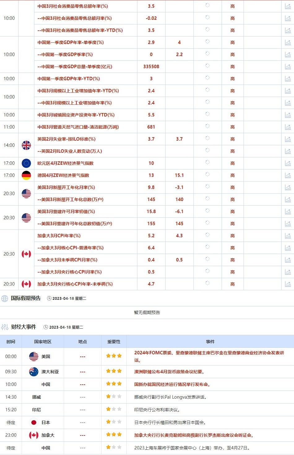 1.加拿大帝国商业银行:经济活动降温不足以阻止美联储5月加息25个基点;①上周五公布的美国3月零售销售月率下降1%,降幅超出市场预期。加拿大帝国商业银行分析师表示,随着消费者变得更加谨慎,美国3月零售销售月率大幅下降,加上近期发布的其他数据,均表明美国经济活动降温;
