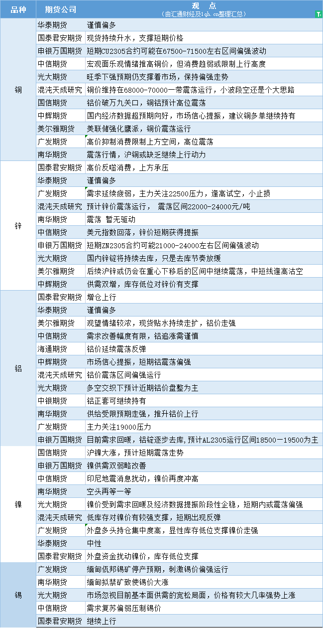 标题:期货公司观点汇总一张图:4月19日有色系(铜、锌、铝、镍、锡等)
