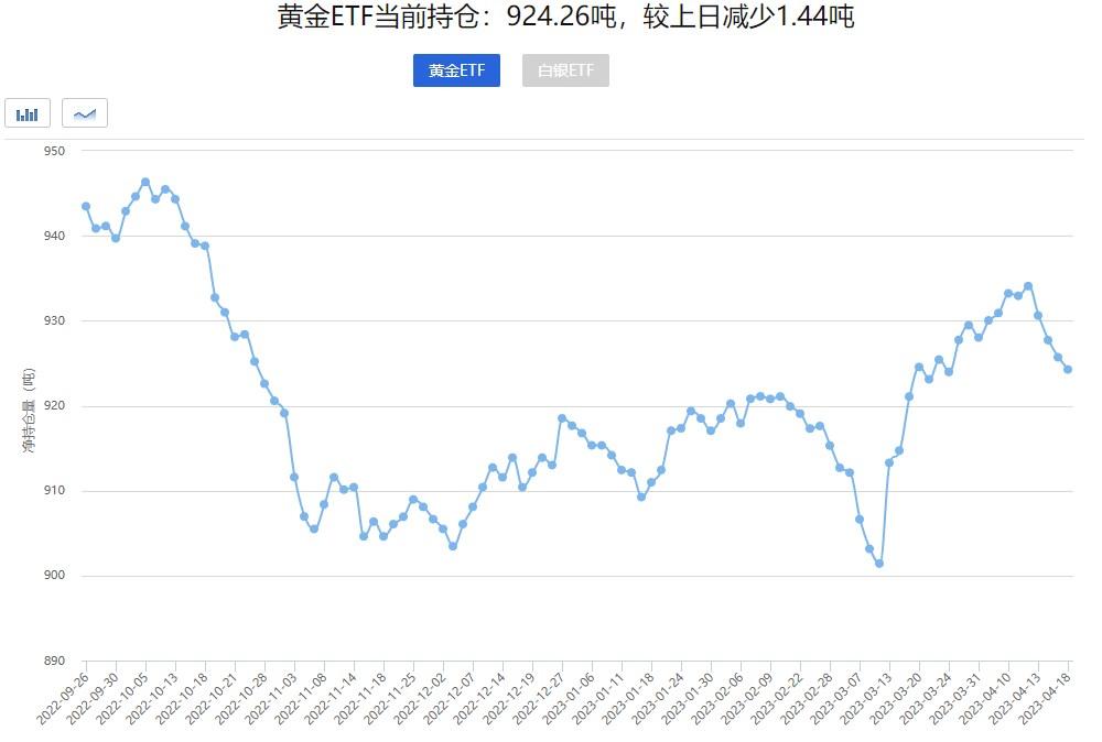 数据显示,全球最大的黄金ETF——SPDR的持仓周一下降1.44吨,至924.26吨,为3月24日以来新低,也是连续四个交易日下降。